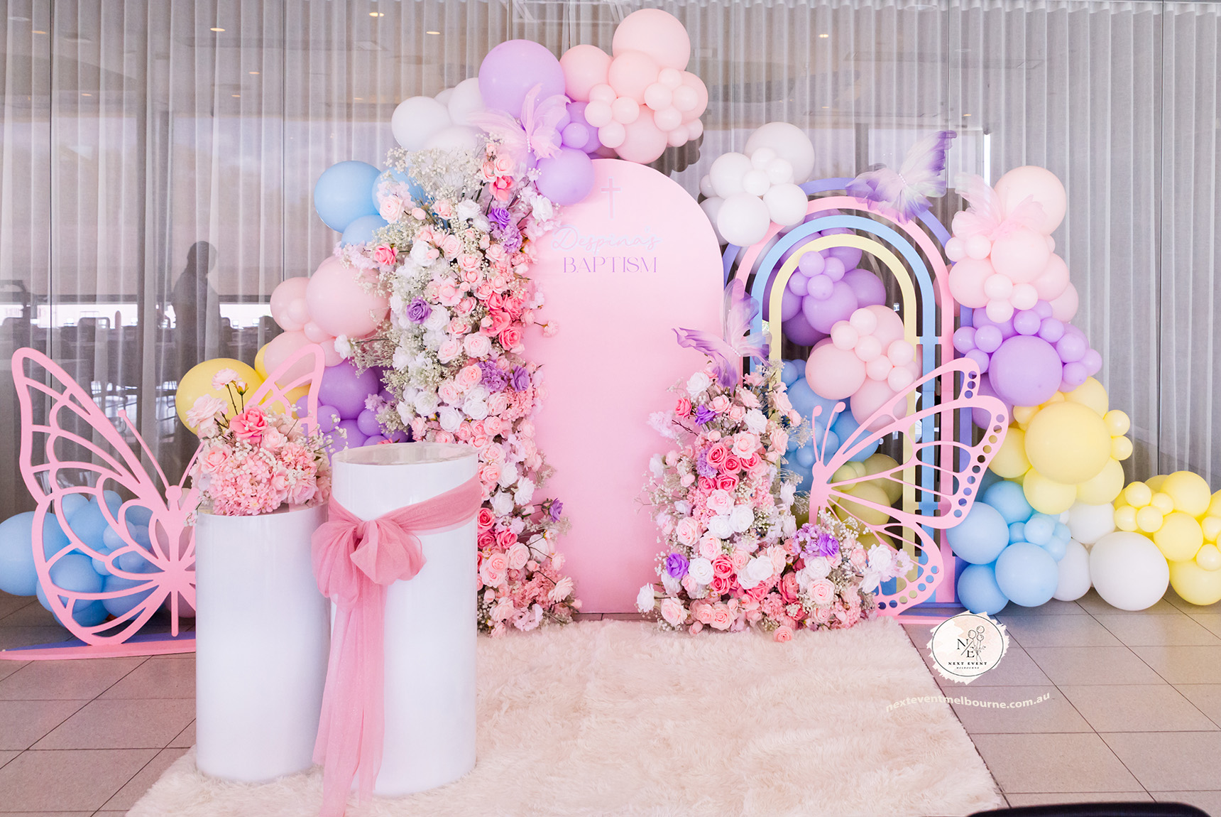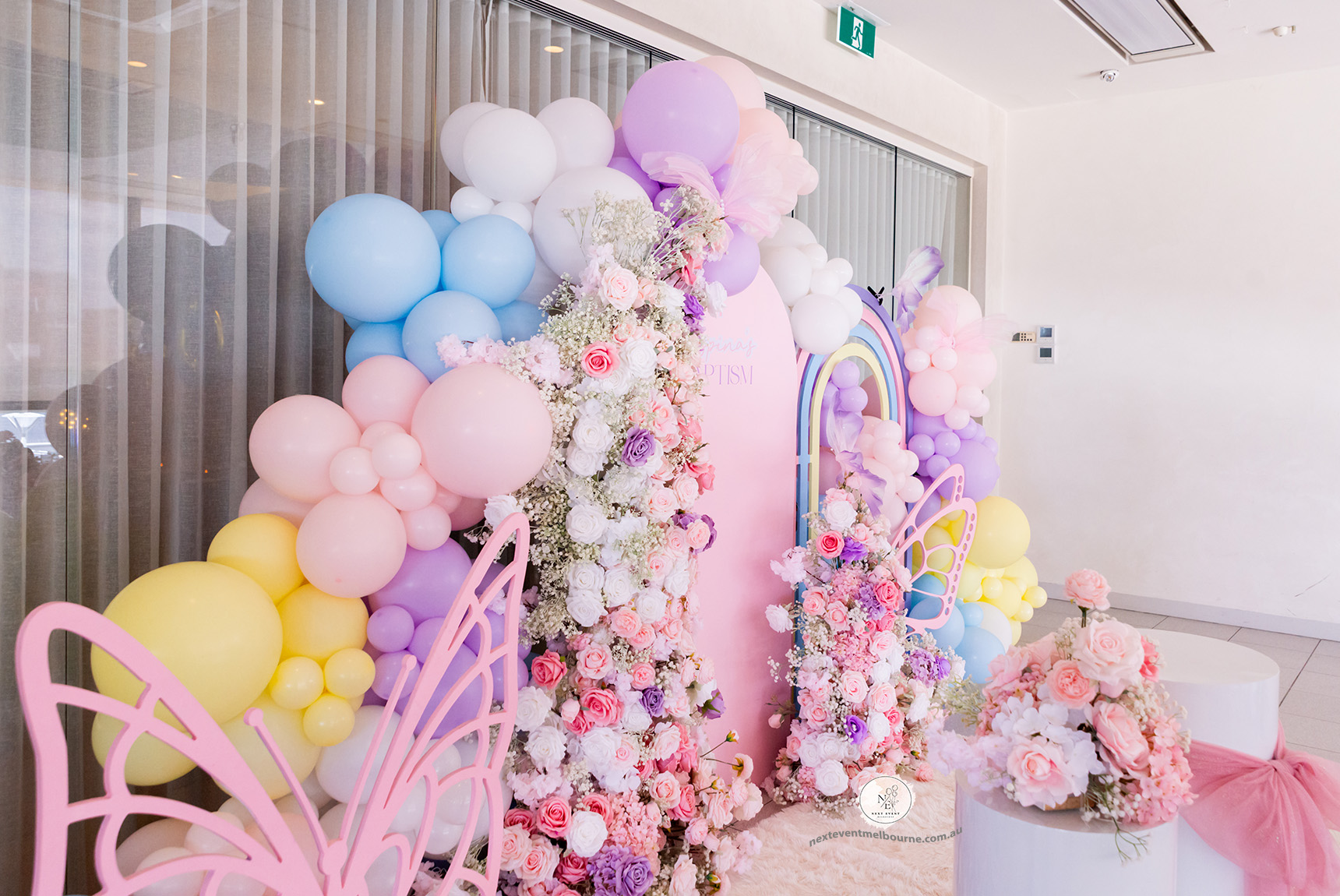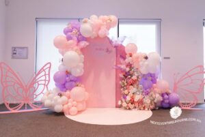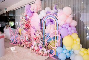 A dreamy pastel setup filled with soft florals, butterflies, and a rainbow backdrop adorned with pastel balloons Every detail styled with love to create unforgettable memories.