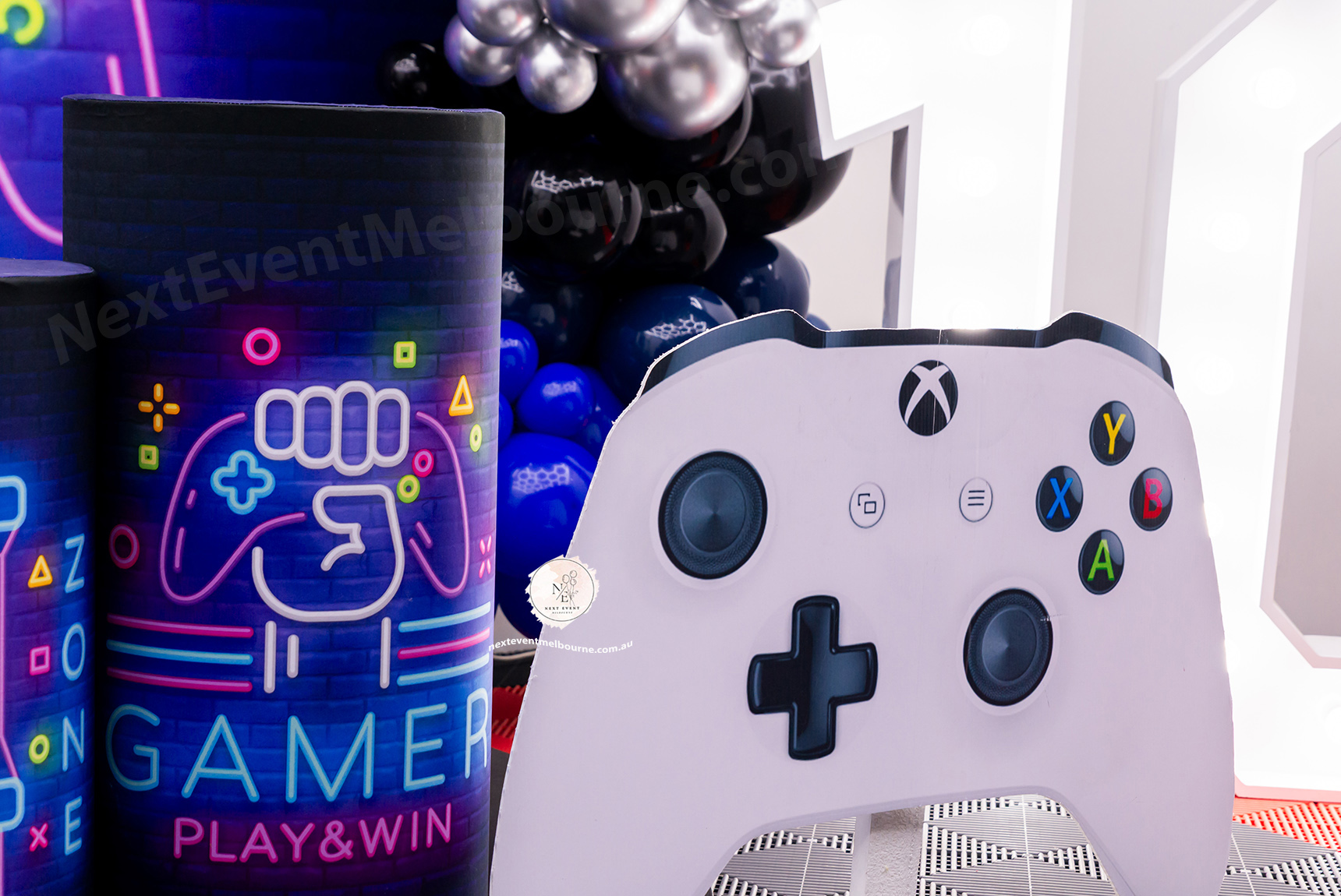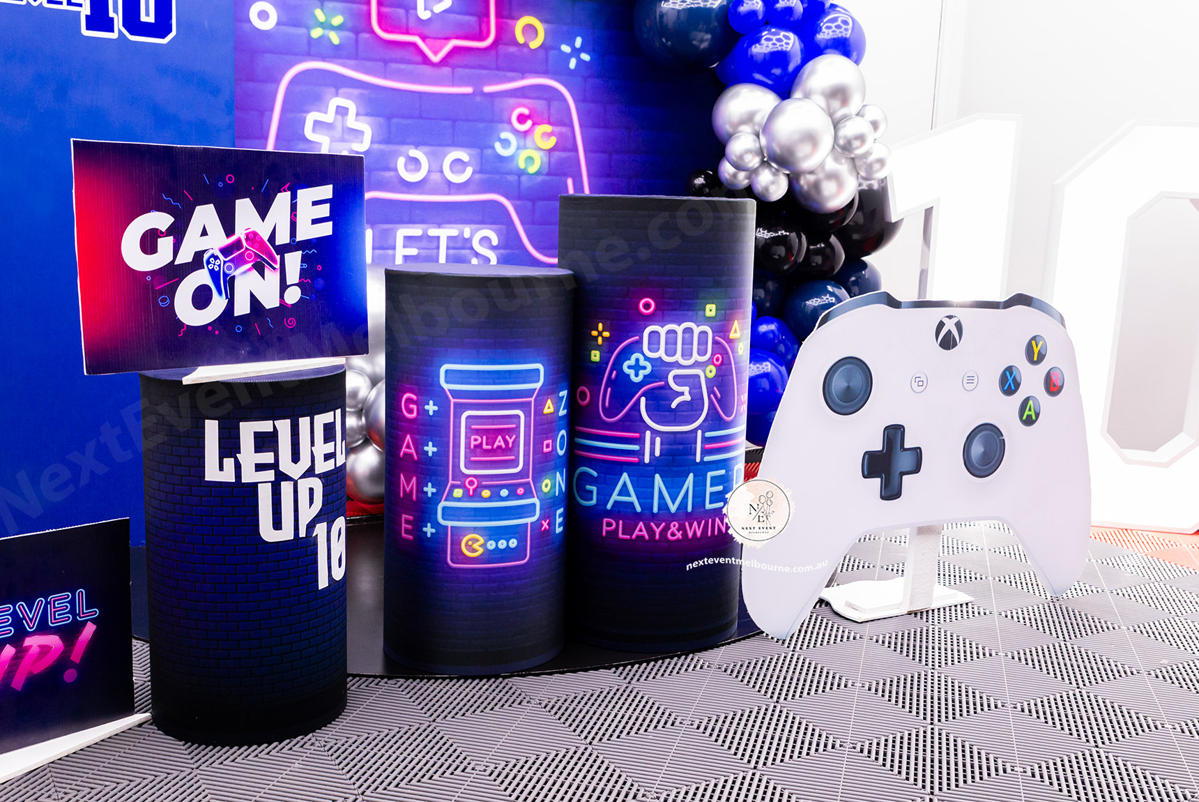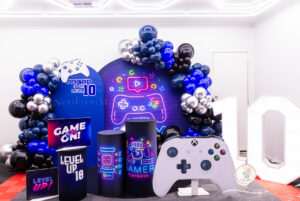 Epic gamer birthday setup for Angad’s Level 10 🕹️ Custom backdrops, neon gaming theme & luxury balloon styling 💙 Styled by Next Event Melbourne